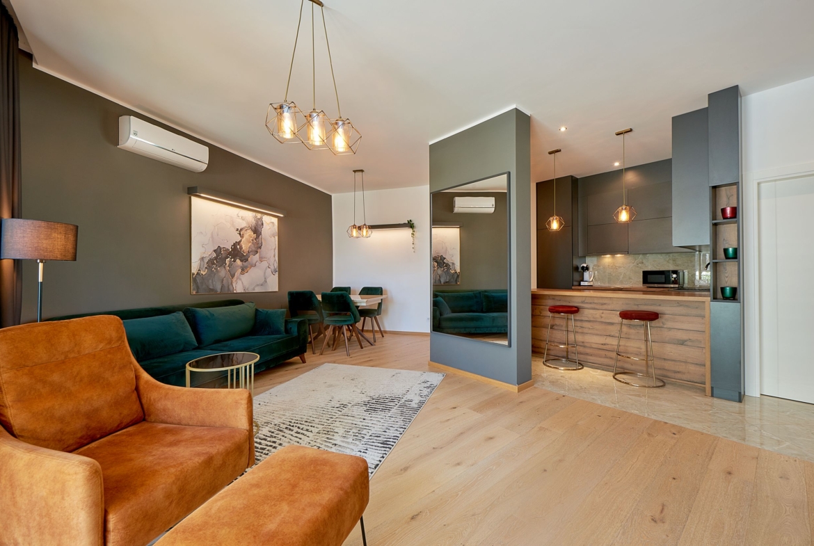 Просторная гостиная с диваном, креслом и современной ТВ-зоной. Обеденная зона на 4 персоны.Кухня: с островом-баром, полностью укомплектованная техникой: