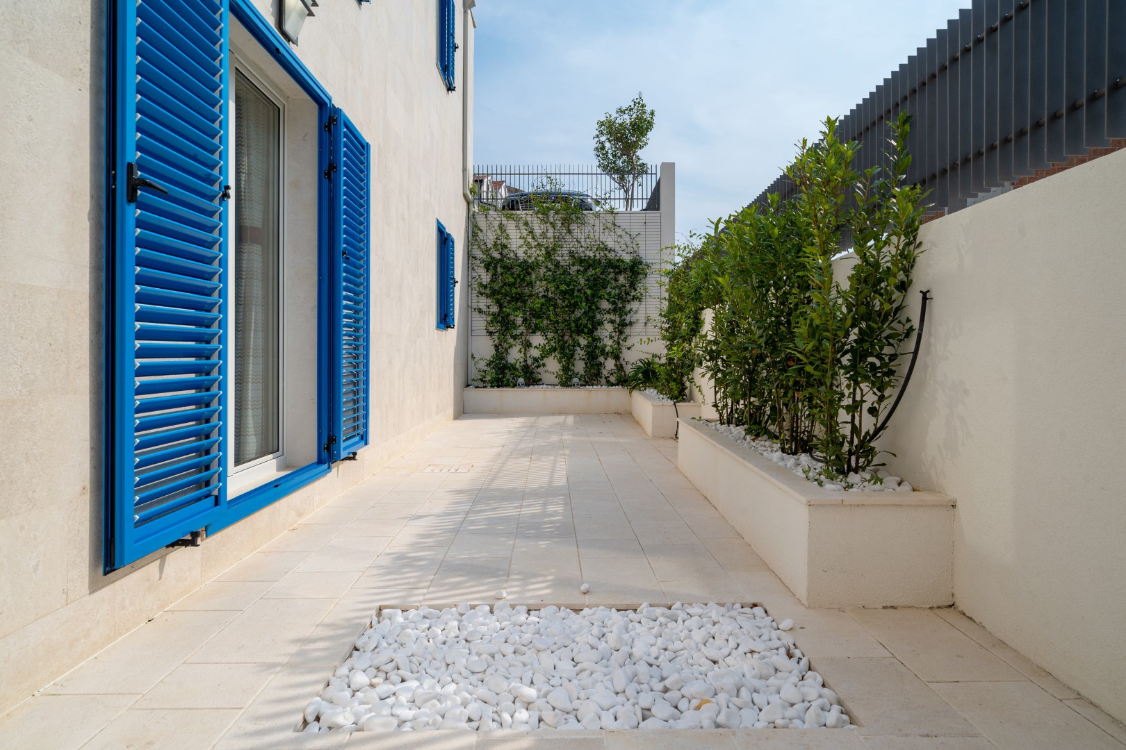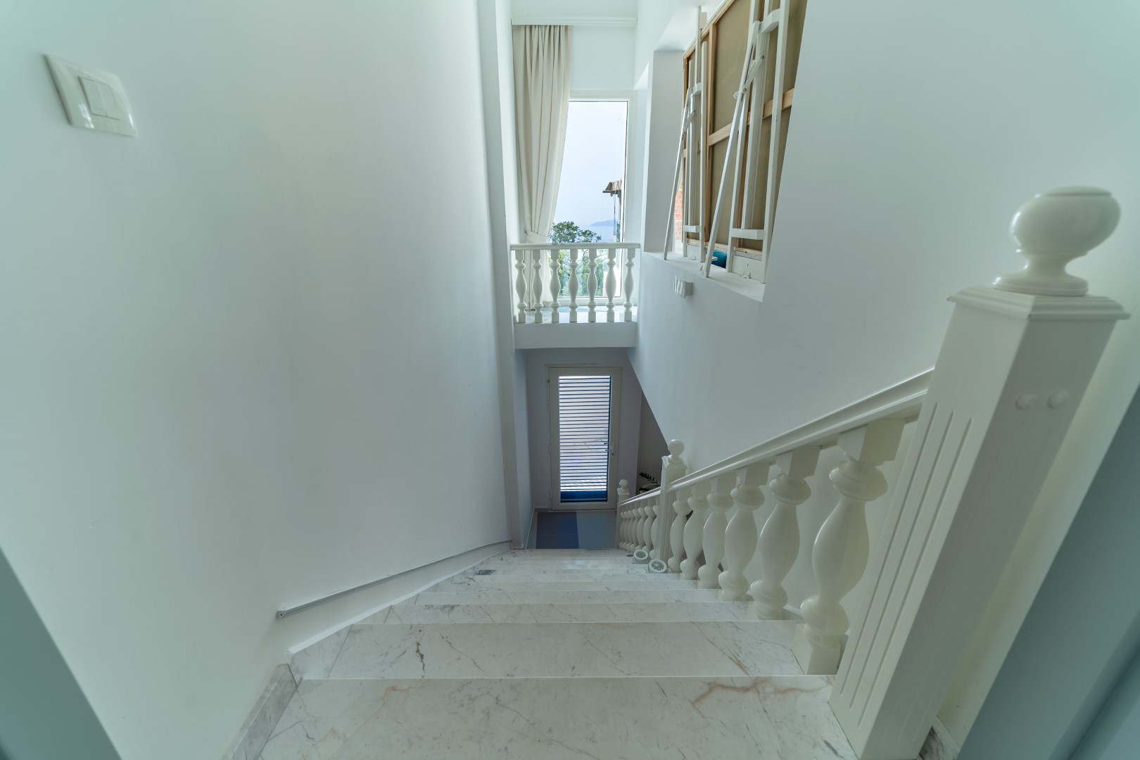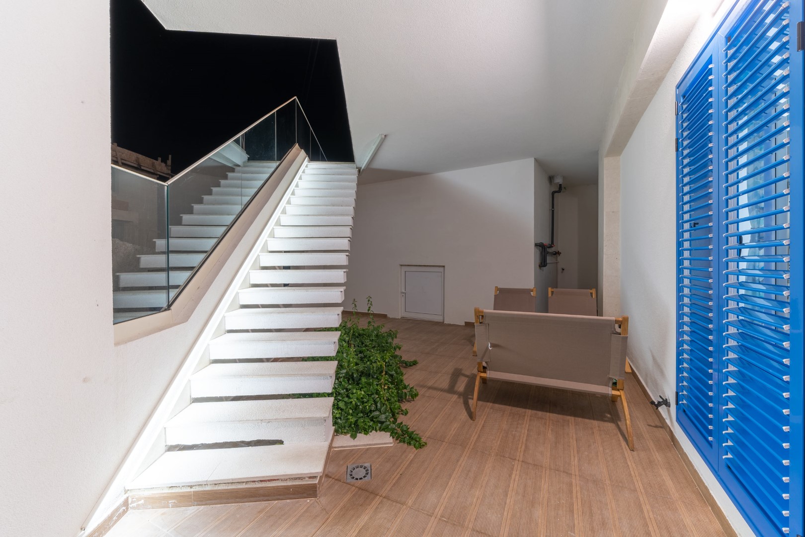 Внутренняя лестница соединяет верхний этаж с нижним этажом, где находятся две спальни, две ванные комнаты и коридор с большими встроенными шкафами. На нижний уровень внутреннего двора можно попасть по внешней лестнице из бассейна, а также из прихожей на нижнем этаже дома.