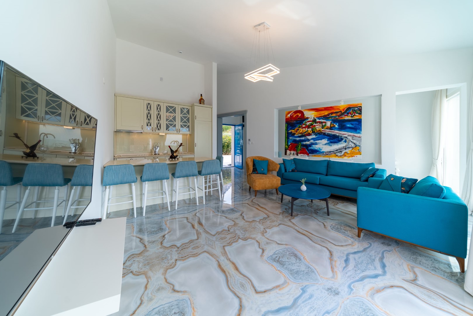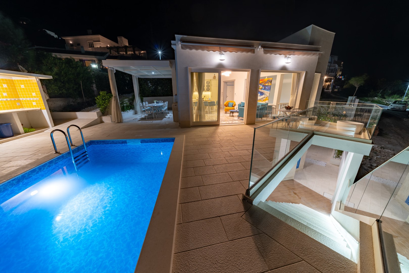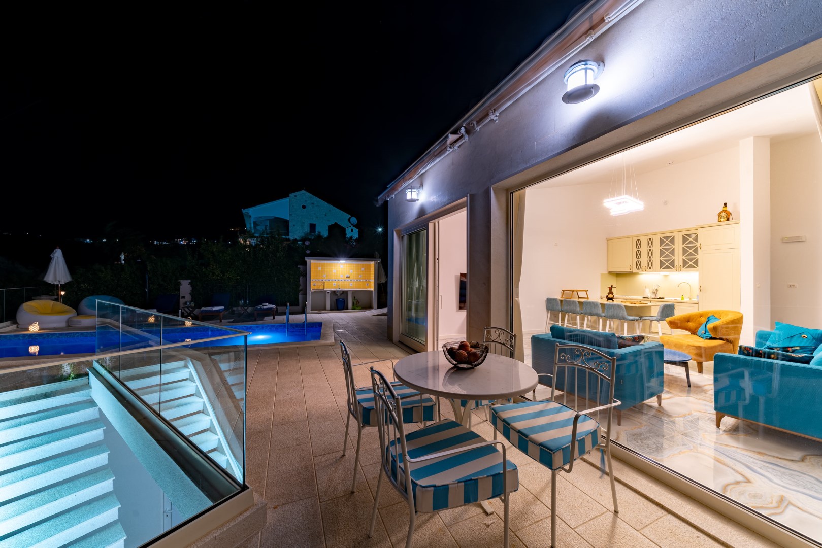 Вход во двор и главный вход на виллу расположены на северной стороне, с выходом на верхний этаж, где находятся гостиная с обеденной зоной и кухня, одна спальня с ванной комнатой и гостевой туалет. Гостиная ведет прямо на большую террасу с бассейном, с летней кухней, душем, барбекю и садом.
