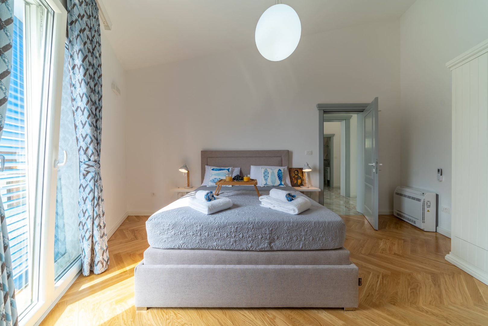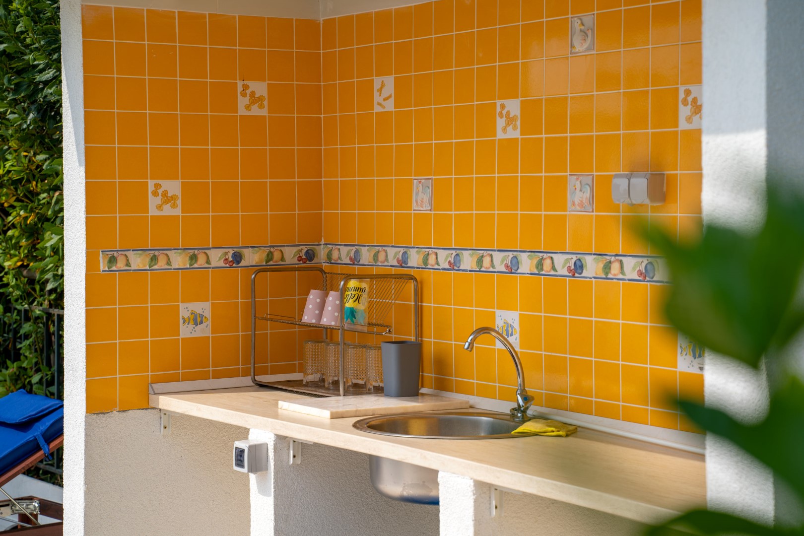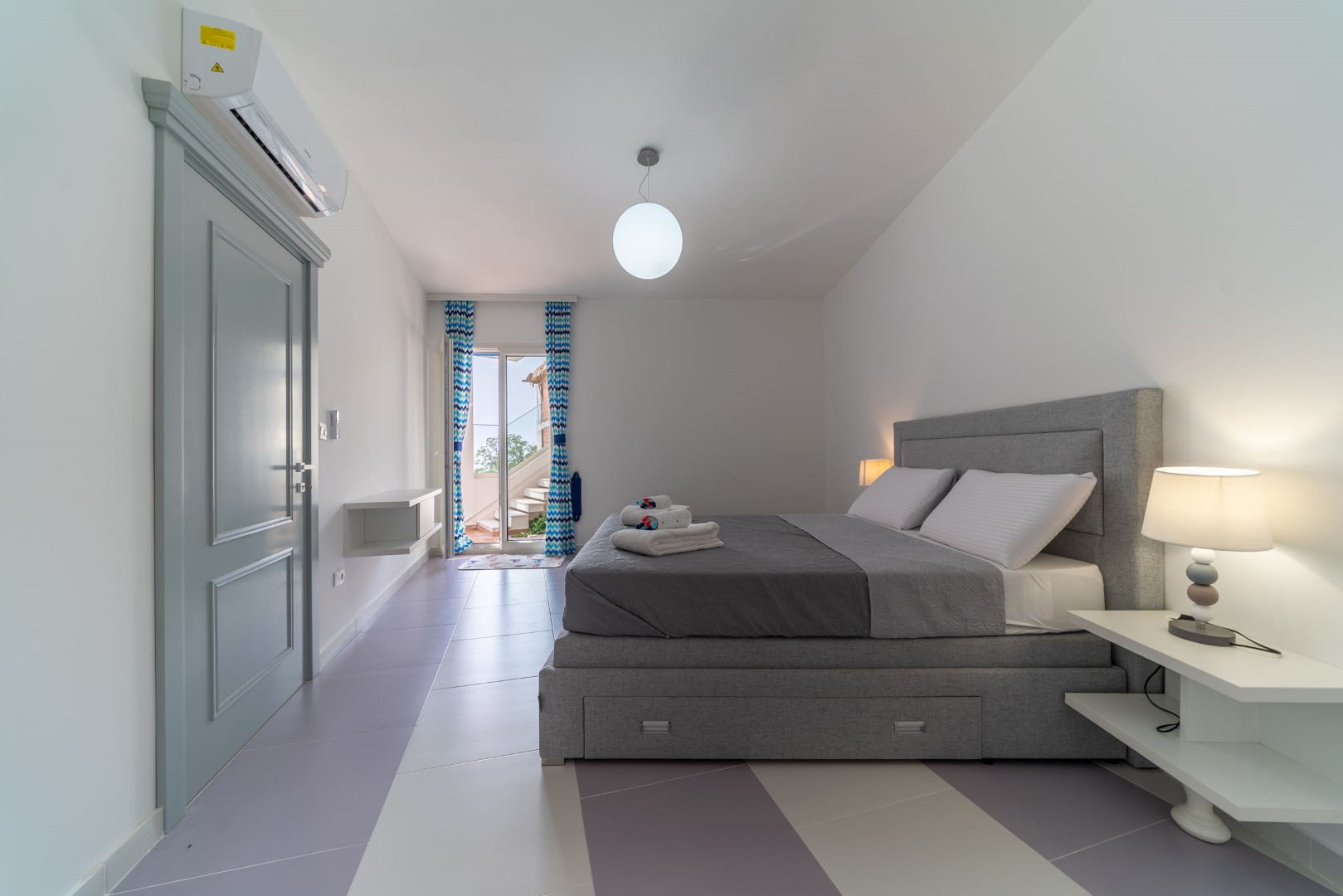 Вход во двор и главный вход на виллу расположены на северной стороне, с выходом на верхний этаж, где находятся гостиная с обеденной зоной и кухня, одна спальня с ванной комнатой и гостевой туалет. Гостиная ведет прямо на большую террасу с бассейном, с летней кухней, душем, барбекю и садом.