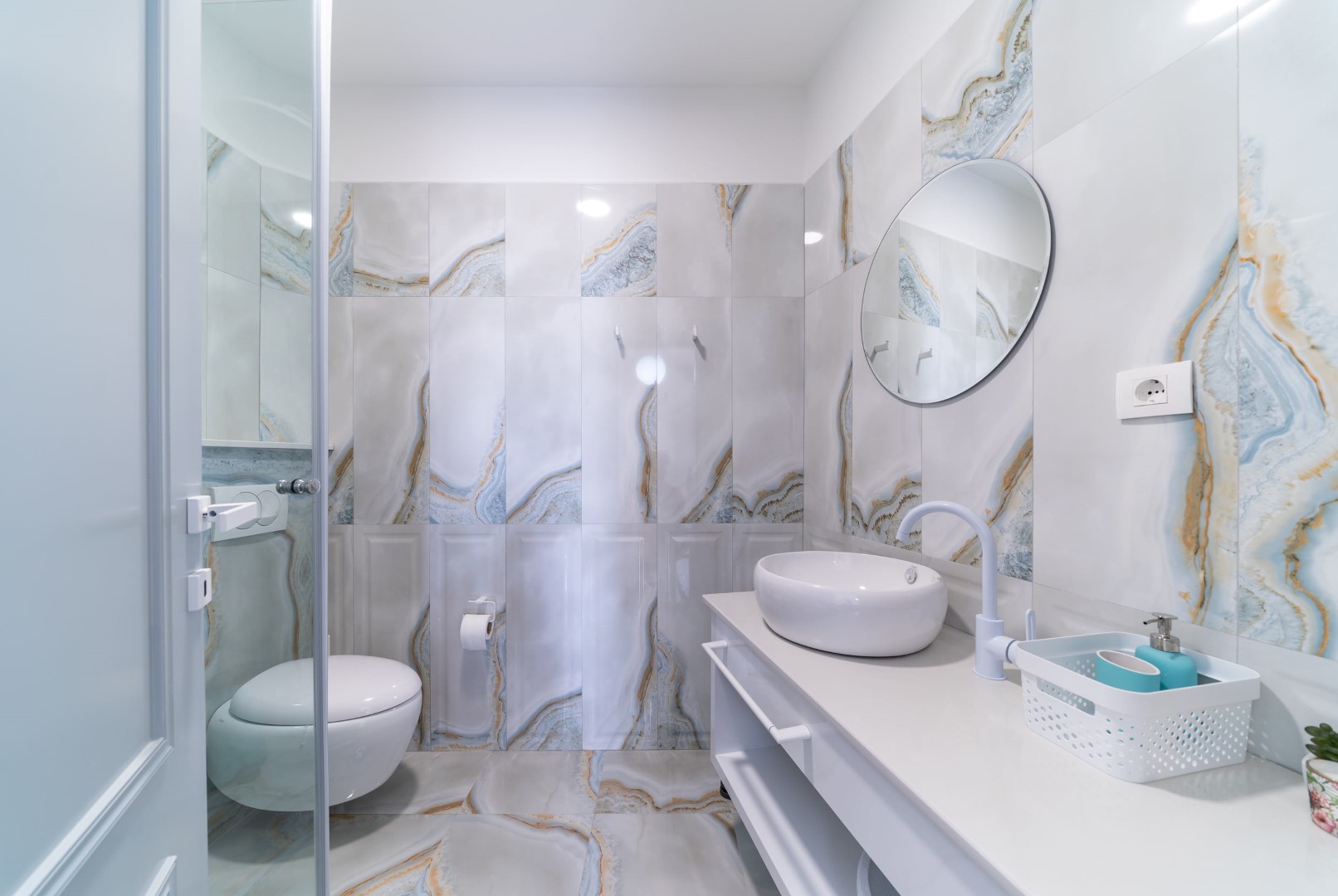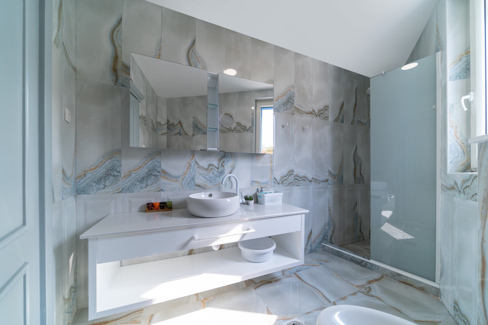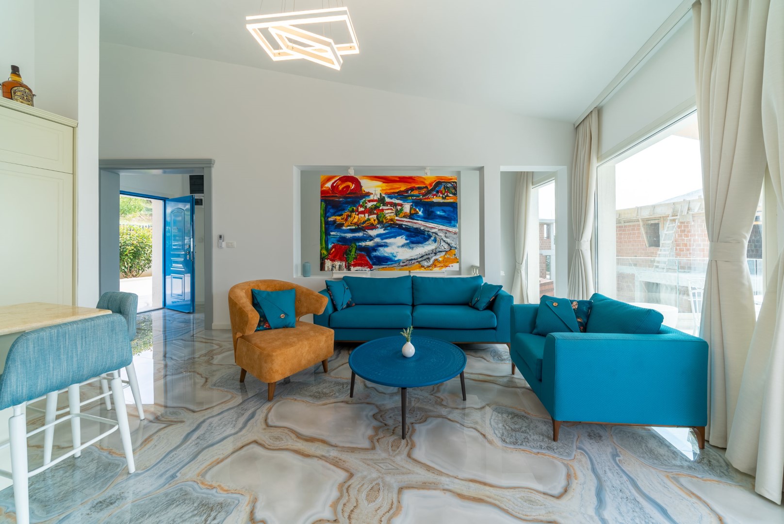 Стены дома покрыты фасадным камнем премиум-класса. Полы в гостиной, кухне, туалете, ванной комнате и двух спальнях покрыты очень дорогой, высококачественной керамической плиткой. Полы в третьей спальне выполнены из паркета высокого класса. Все балконные двери и окна выполнены в трехслойной комбинации дерево-алюминий. Особое внимание было уделено прекрасно работающей системе гидроизоляции кровли и стен.