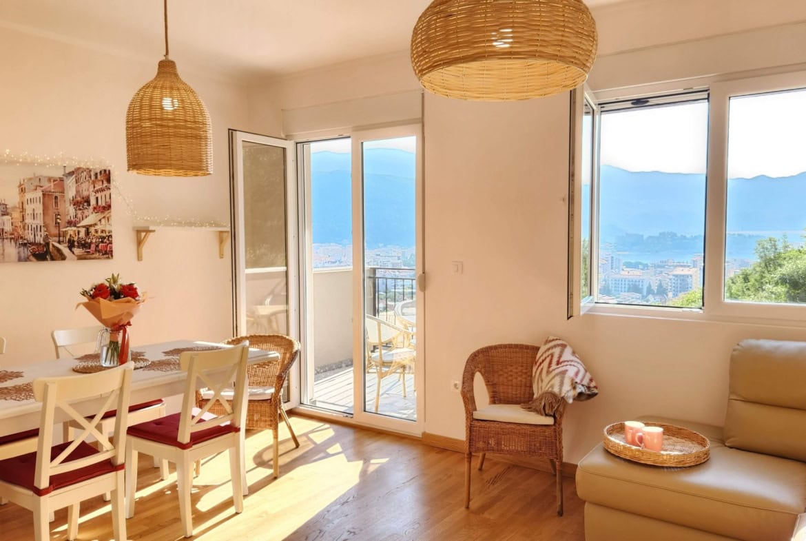 Продается квартира с 2 спальнями площадью 65 м2 с панорамным видом на всю Будву, море и горы.