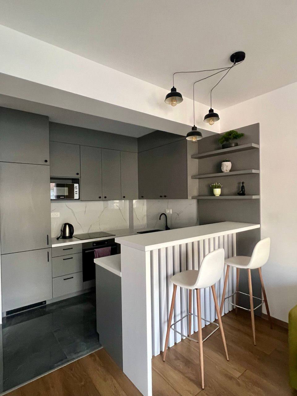 • Кухня-гостиная: Укомплектована встроенной техникой (духовой шкаф, микроволновая печь), рабочая зона отделена функциональной барной стойкой со стульями. В гостиной установлен диван и ТВ.