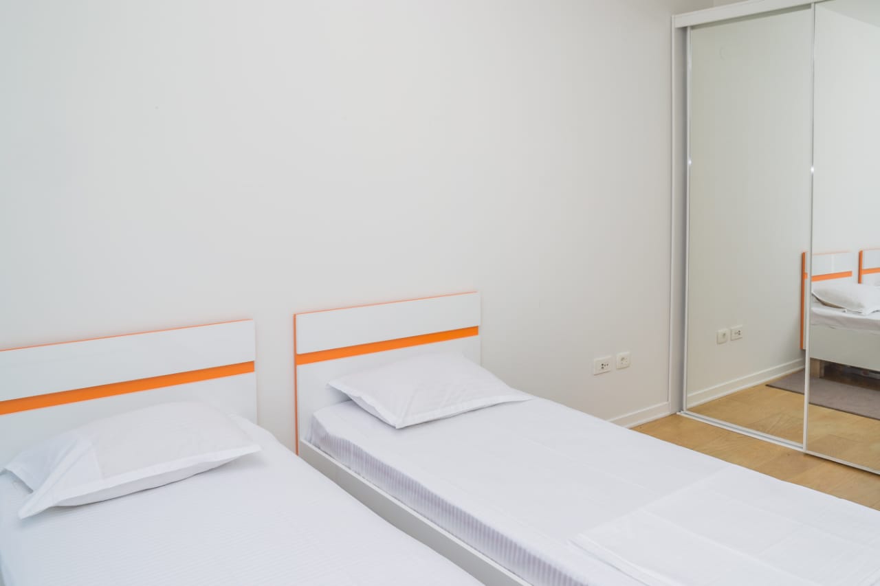 Апартаменты в центре города Будва, в 50 метрах от променадной зоны и пляжа. Располагаются в апарт отеле Tre Canne 4* и имеют отличный показатель по сдаче в аренду. Апартаменты в данном отеле имеют большую популярность и востребованность. В здании расположен большой подземный паркинг, ресепшн, спа центр, рестораны и кафе. Апартаменты, полностью меблированы и оборудованы и состоят из гостиной, объединенной с кухонной и обеденной зоной, двух спален, ванной комнаты и сан.узла, а так же просторной террасы с видом на море