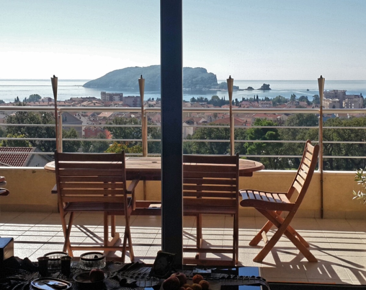Квартира просторна, состоит из 2-х спален, гостинной и комнаты- гардеробной, ванны с джакузи и отдельная душевая/туалет для гостей, два балкона плюс одна терраса – все с панорамным видом на море и Будву.