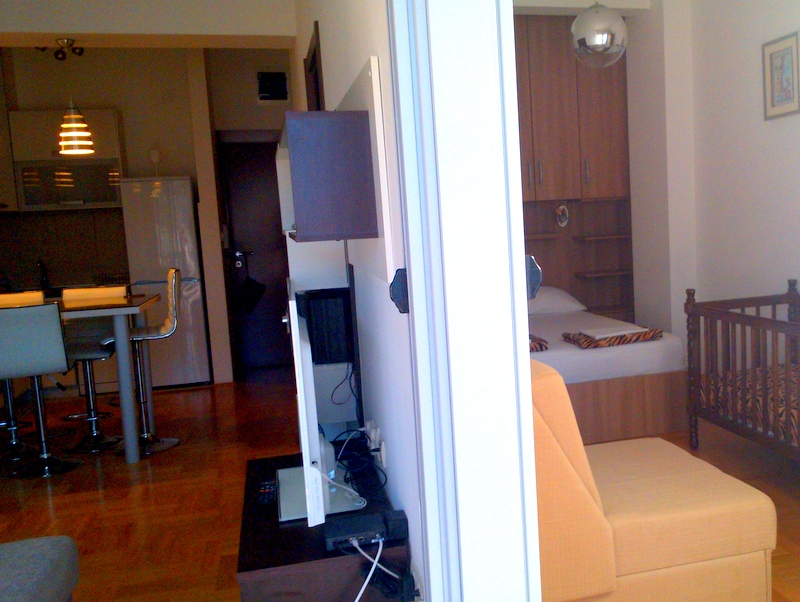Очень красивая современная двухкомнатная квартира 41 кв. м, в центре Будвы, в районе Адок, в новом современном доме необычной архитектуры. Квартира состоит из светлой и меблированной по дизайн проекту гостиной, совмещенной с кухонной зоной, из которой есть выход на большую застекленную террасу (12 кв. м). Спальня изолирована и имеет выход на террасу, с которой открывается красивый вид на море и город Будву. В комнатах дубовый паркет, в кухонной зоне и санузле итальянский кафель Parcelanosa, Veis, пол с подогревом Rehauв санузле. В подъезде лестница отделана керамогранитной плиткой, хромированные перила. В квартирах установлены интерфоны, система приточно-вытяжной вентиляции и сплит-система кондиционирования Fujitsu, система пожаротушения и пожарной сигнализации, система защиты от солнечных и УФ лучей, телефон, интернет, кабельное телевидение, входные двери повышенной безопасности, специальные стеклянные перила и ограды, бесшумные сантехнические трубы, итальянская сантехника. На входе в дом на 1 этаже оборудовано рабочее место для консъержа, установлен бесшумный лифт SCHINDLER