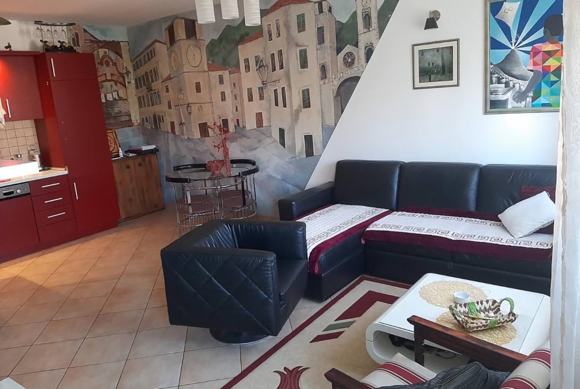 Полностью меблированая однокомнатная квартира.  Состоит из гостиной с кухонной зоной и спальни, есть вид на море. Квартира находится на второй линии от моря, в начале Доброты. (рядом с рестораном Dobrotski Dvori )