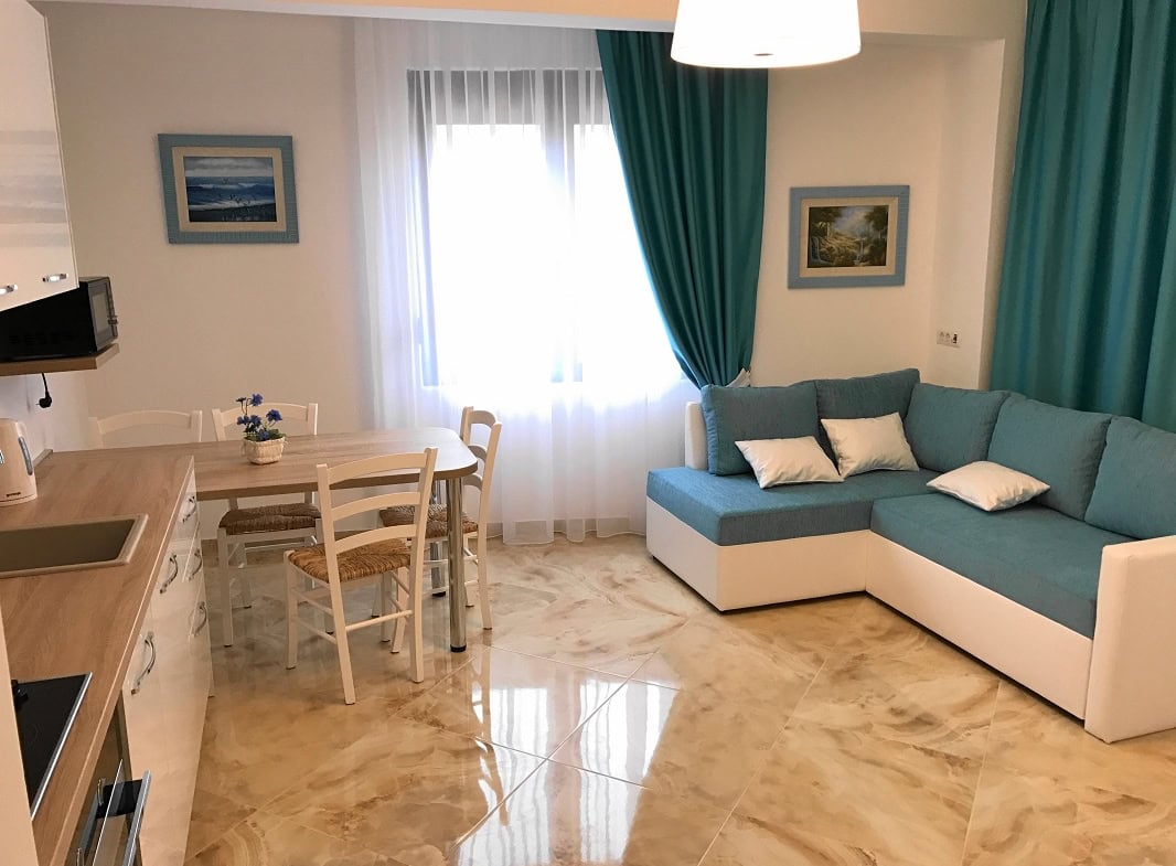 Стильно оформленные апартаменты укомплектованы мебелью и всем необходимым для жизни. Теплый пол по всей квартире, кондиционирование, домофон, интернет, спутниковое телевидение.