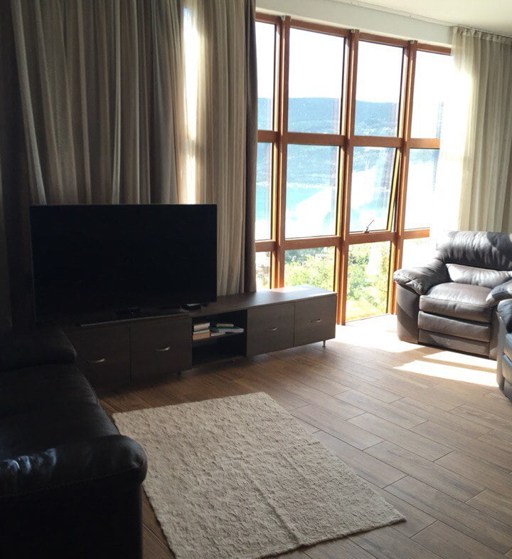 К квартире прилагается - крытая парковка на один автомобиль. В гостиной панорамное остекление.