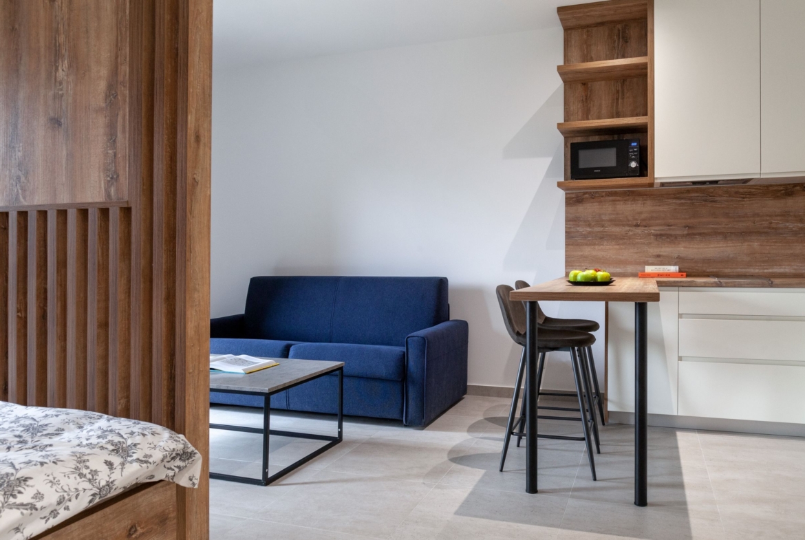 Благодаря продуманной организации пространства студия гармонично разделена на зону отдыха и кухонно-обеденную зону, что делает её удобной как для постоянного проживания, так и для краткосрочной аренды.