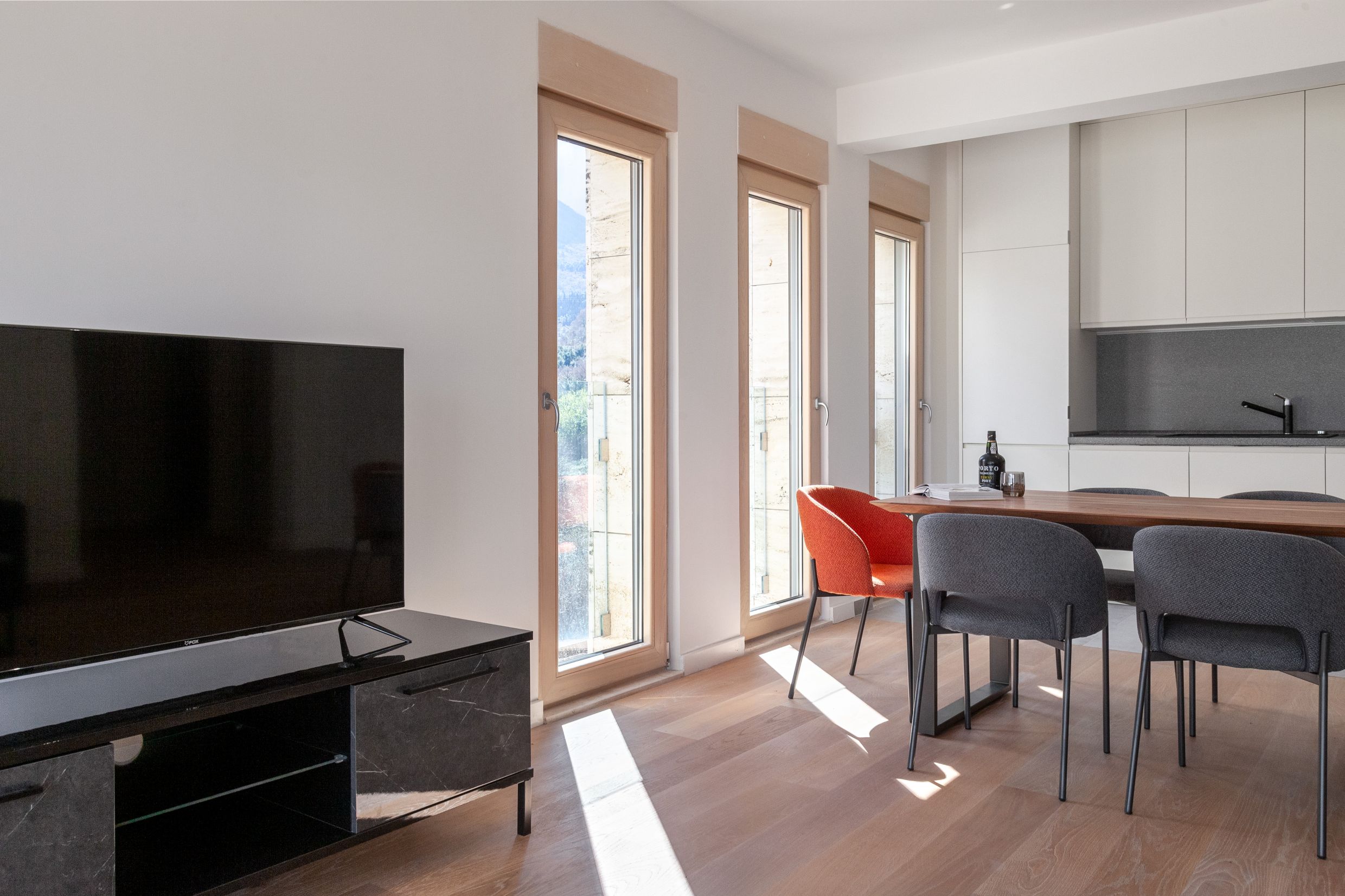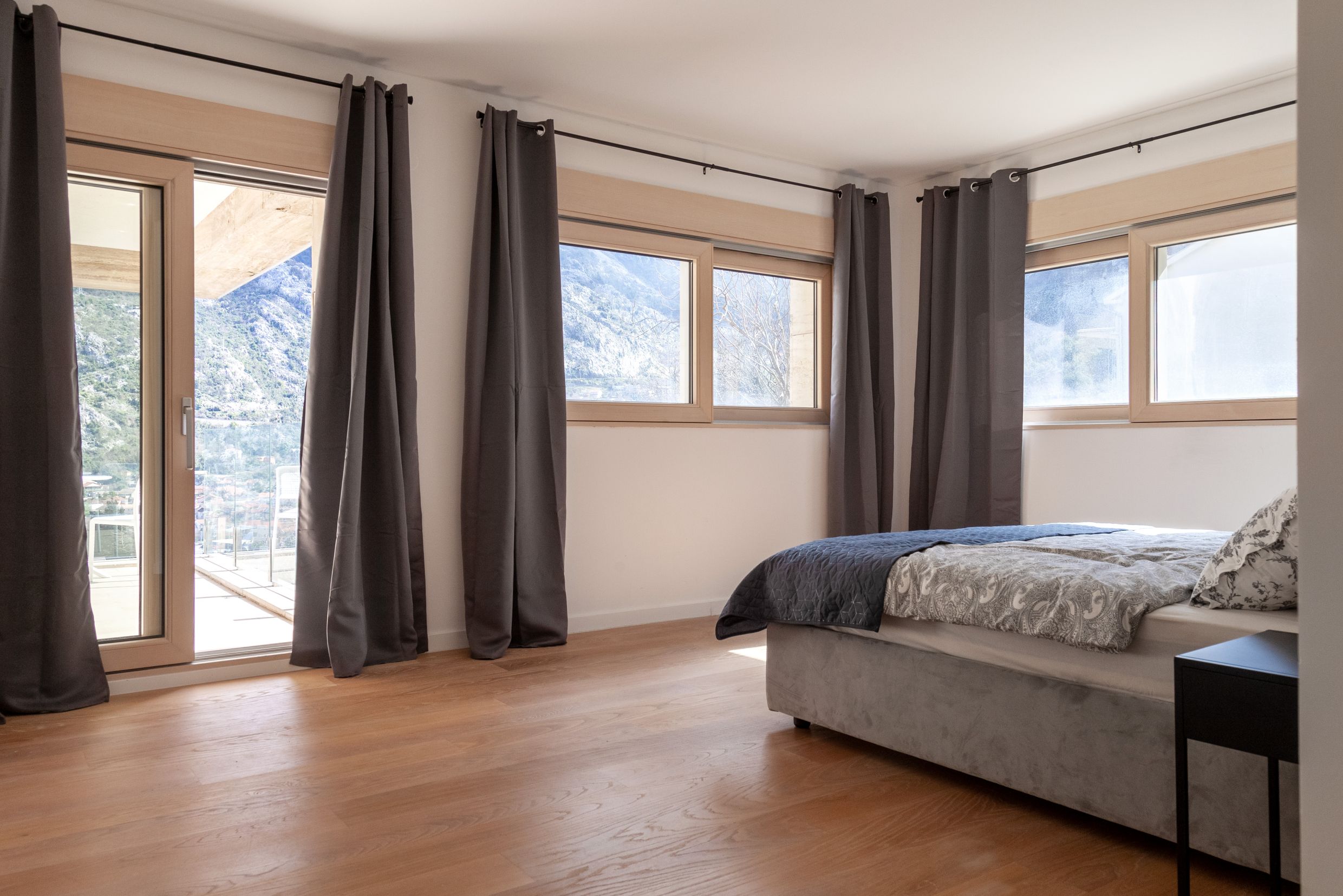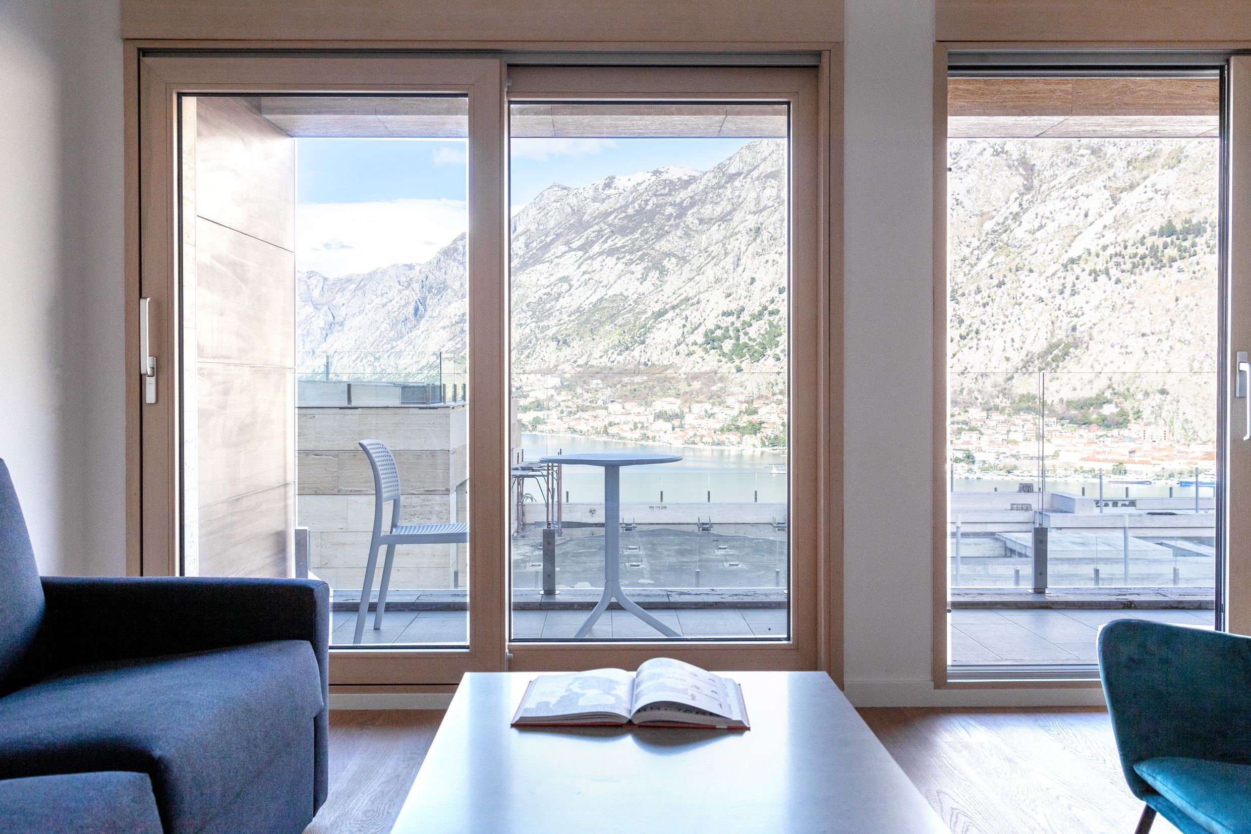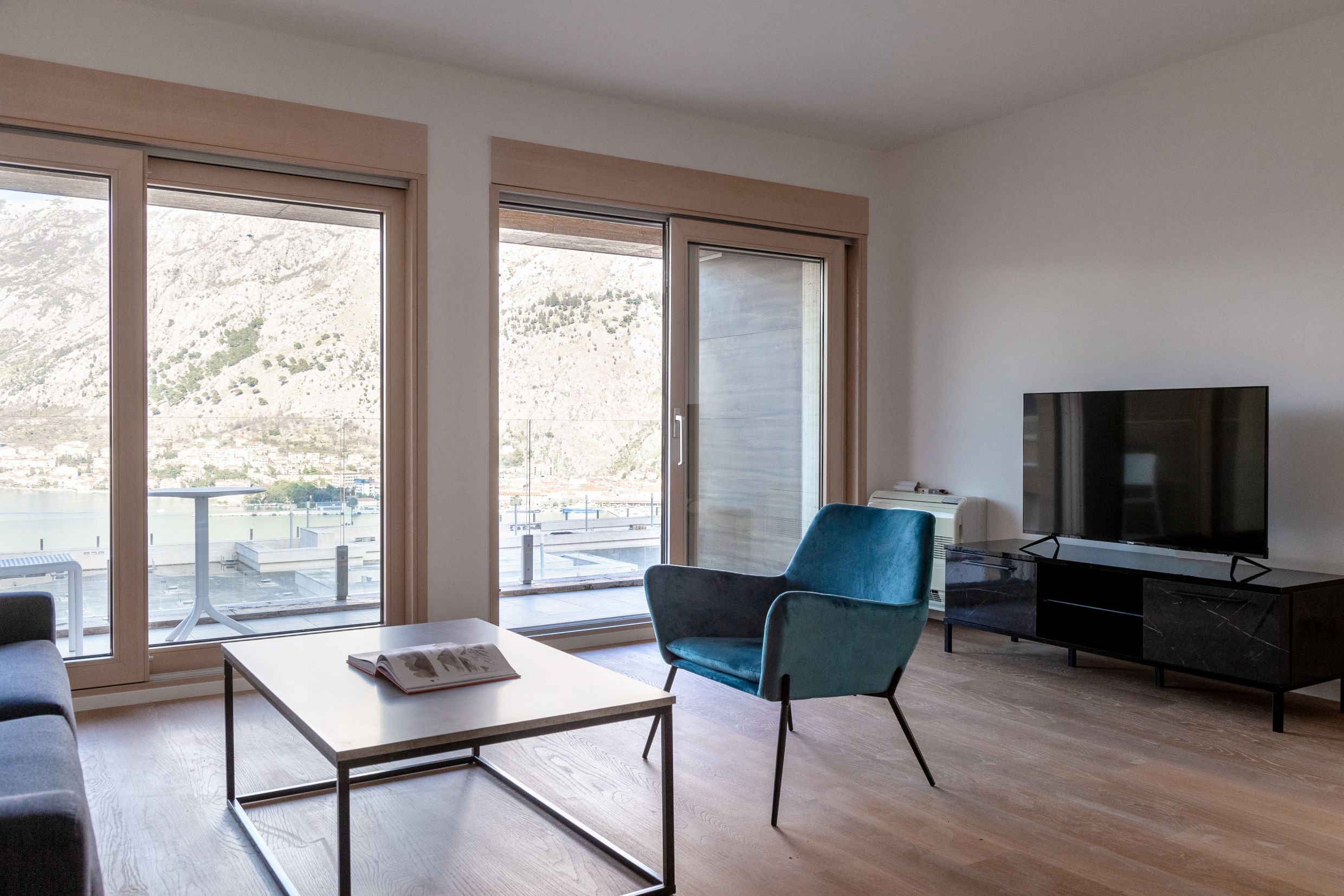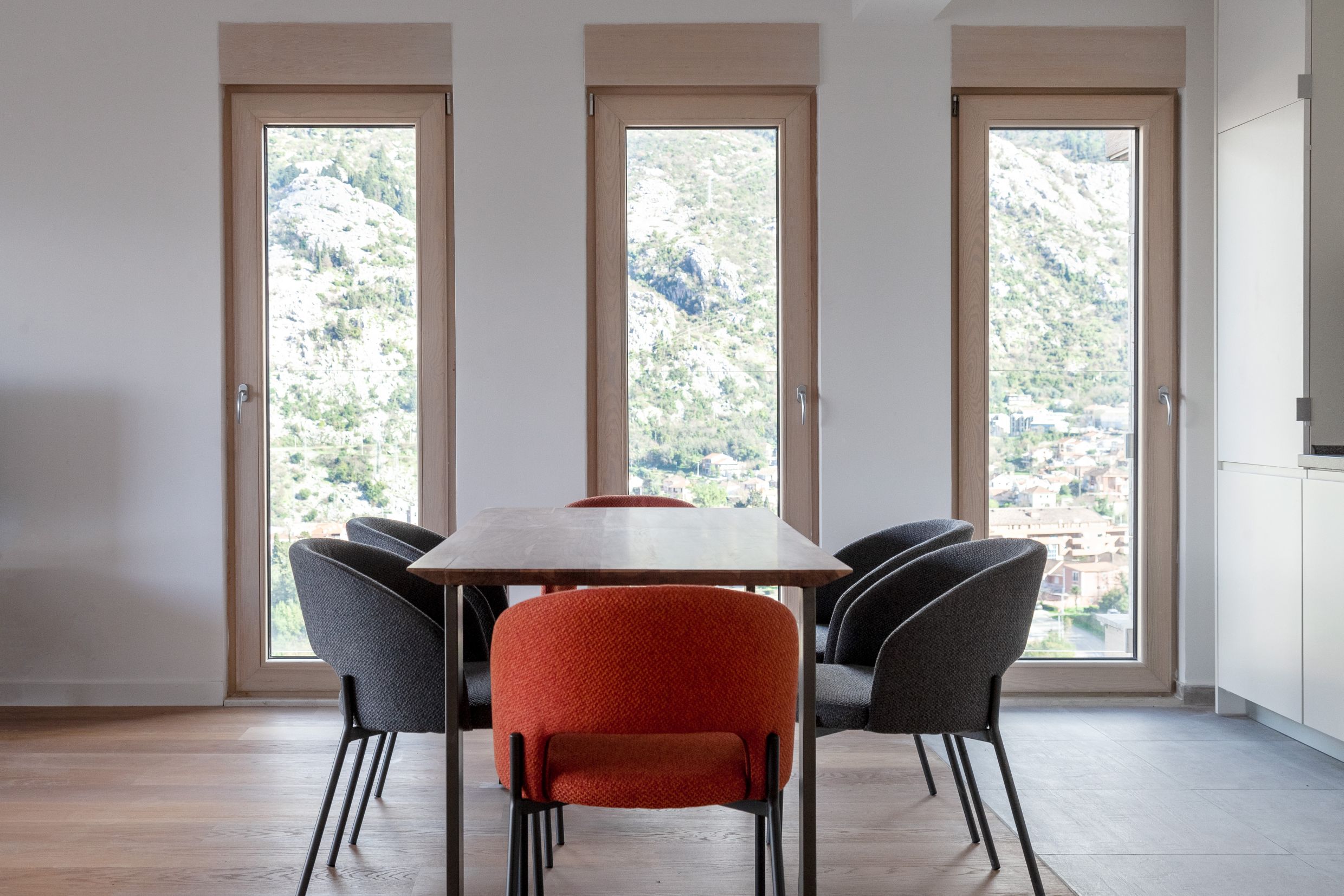 Апартаменты спроектированы таким образом, чтобы из каждого уголка открывались два уникальных пейзажа — бескрайний горизонт Адриатического моря и величественные горные хребты Черногории.