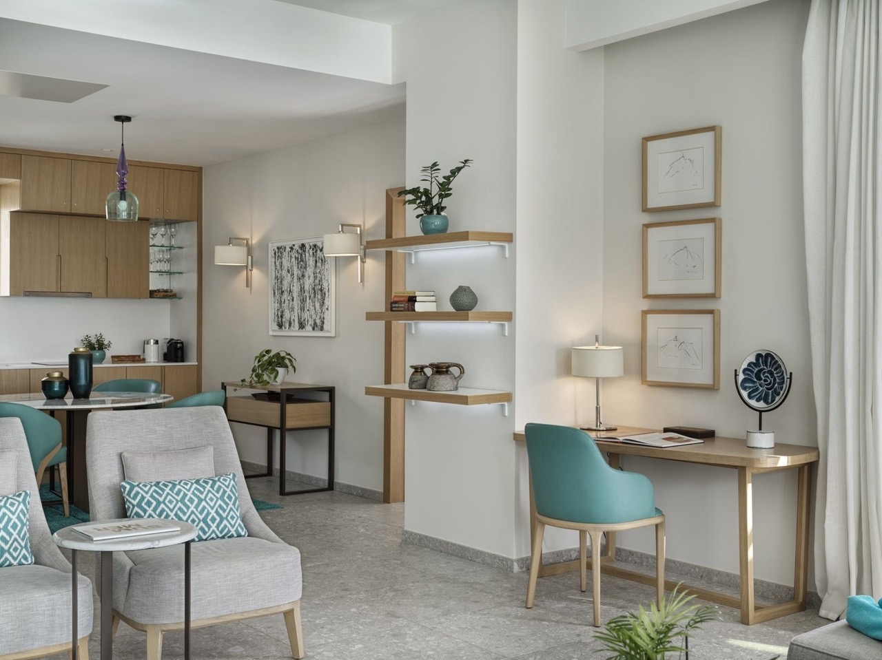 • Просторная гостиная открытого типа с полностью оборудованной кухней и столовой