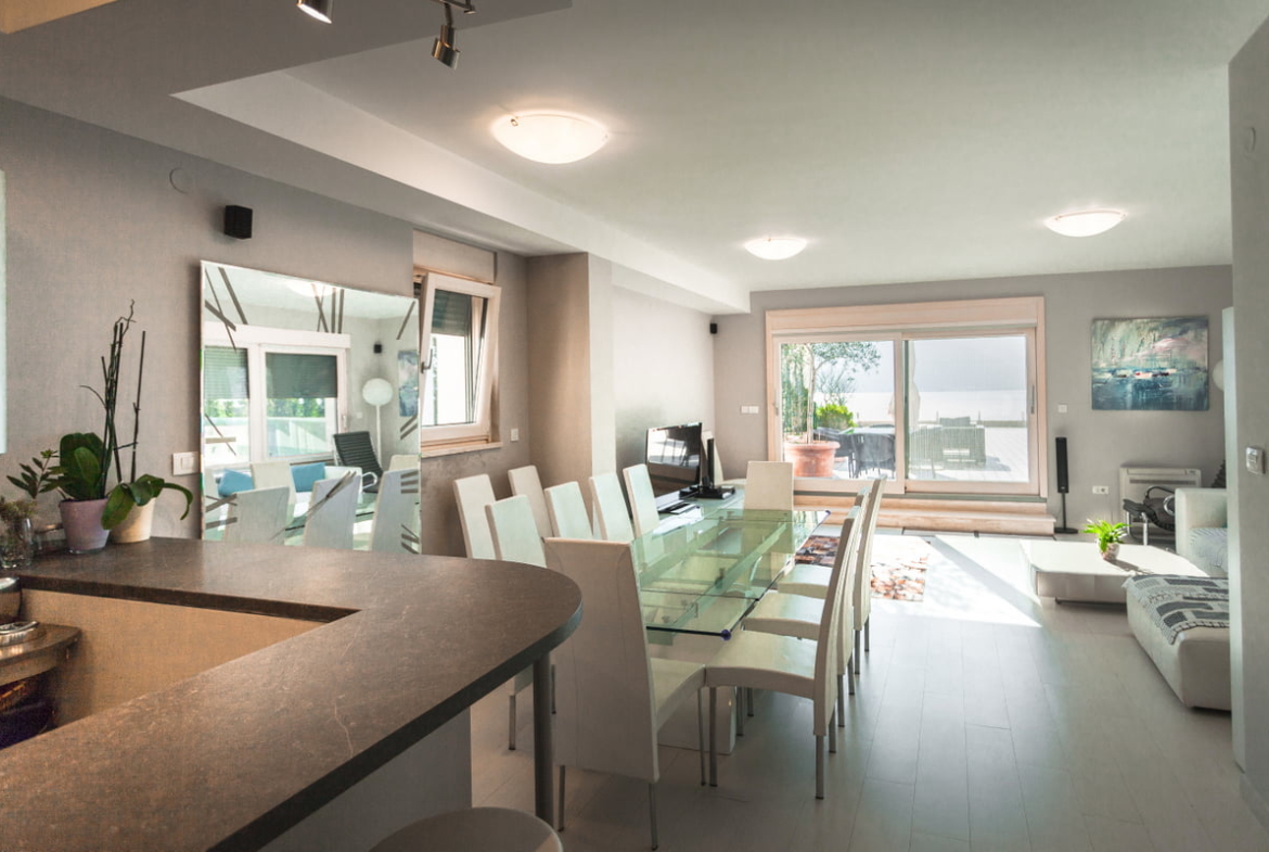 Из гостиной выход на самую главную террасу Дуплекса, из которой открывается незабываемый вид на Которский Залив. На террасе расположен обеденный стол на 6 персон и уличная мебель для отдыха, солнцезащитные зонты и джакузи. Однажды, отдохнув на этой террасе, вы ощутите себя в полной гармонии и блаженстве бытия, от одного только панорамного вида на прекрасный залив, окруженный живописными горами. Тишина и Спокойствие самые лучшие соседи этого объекта.
