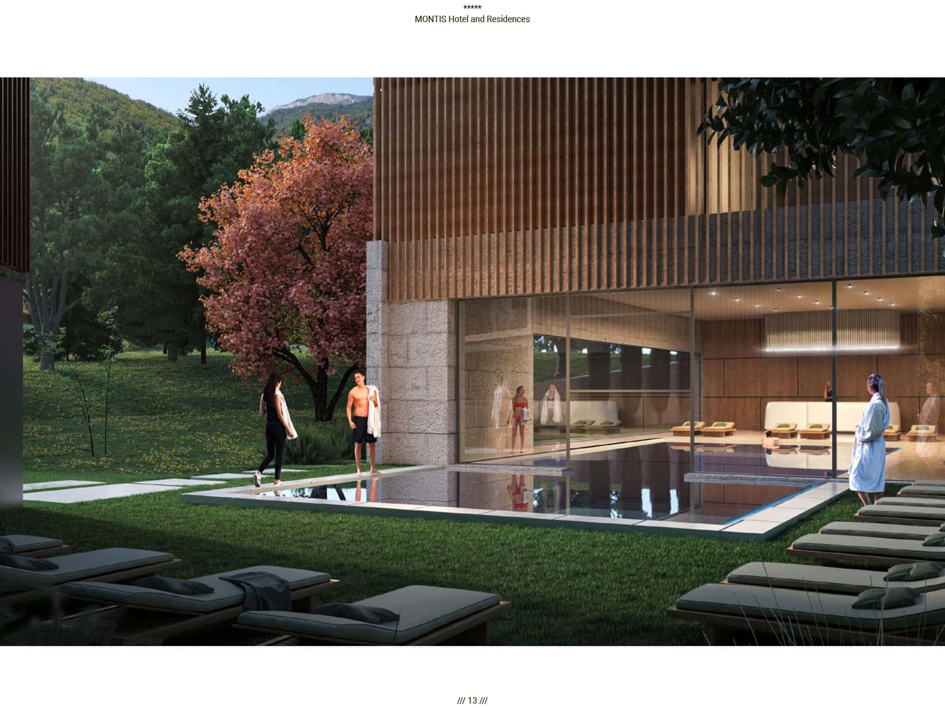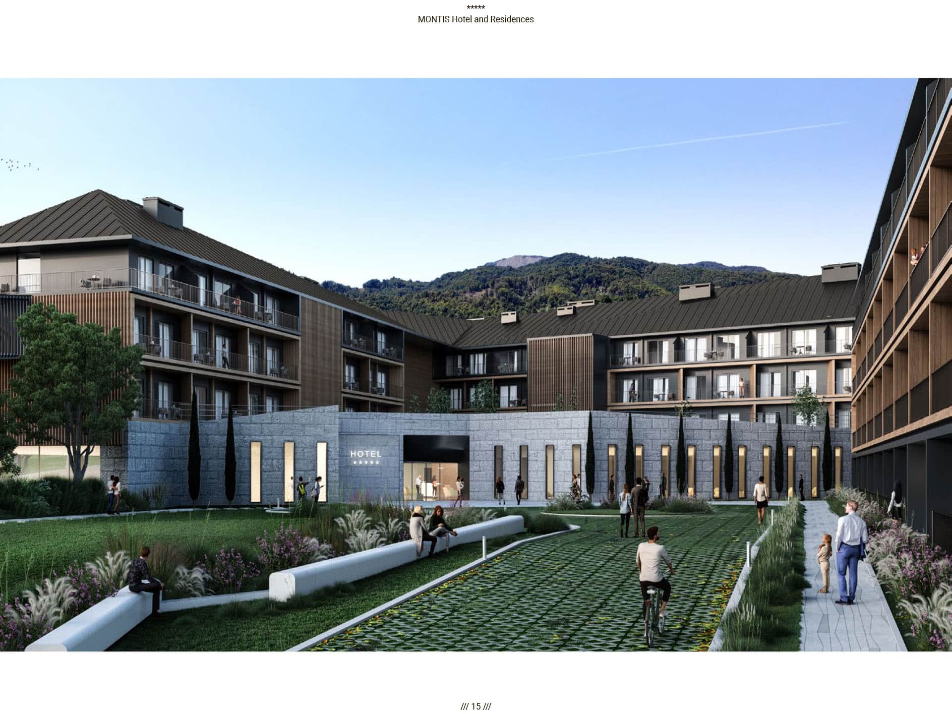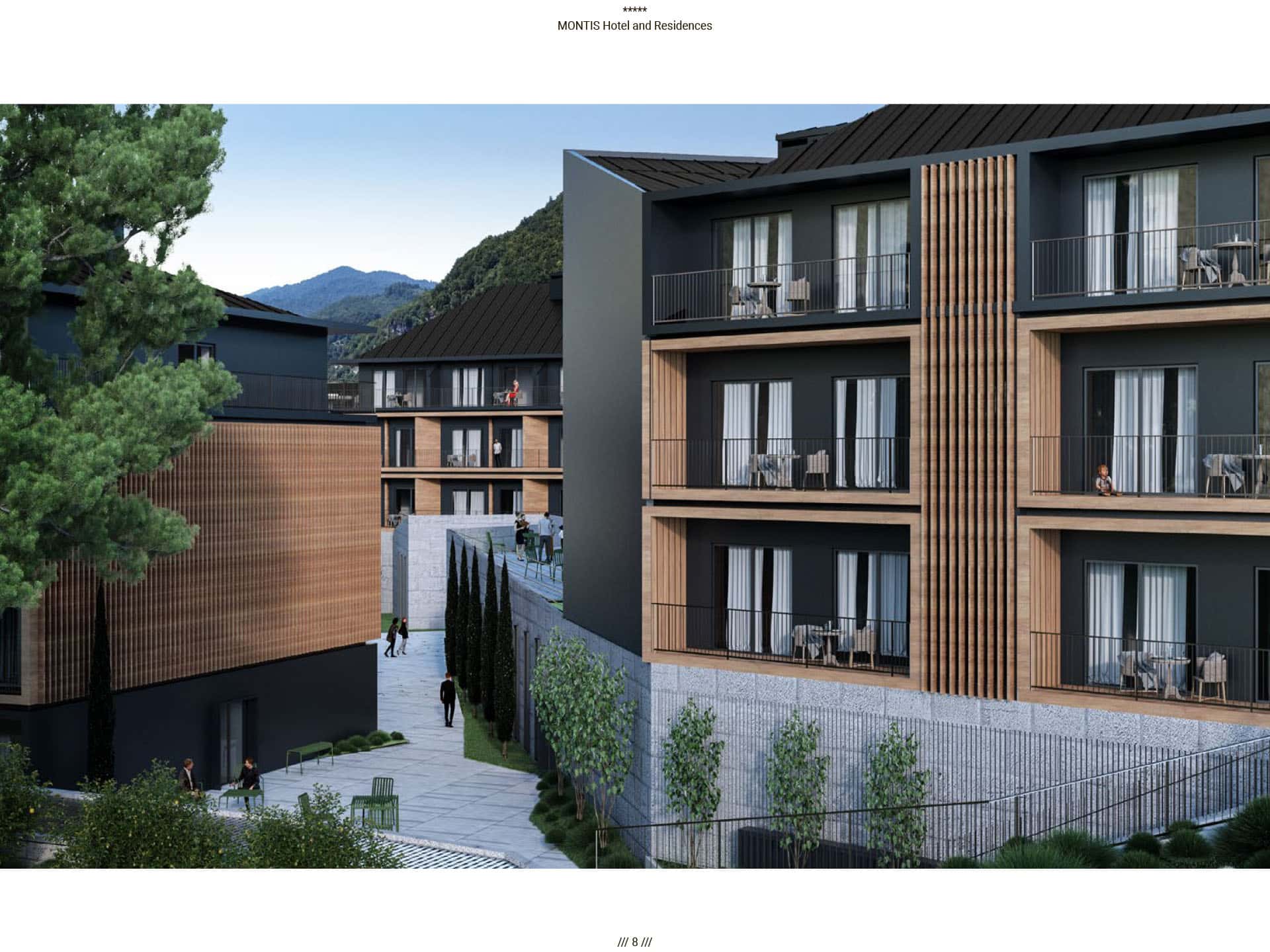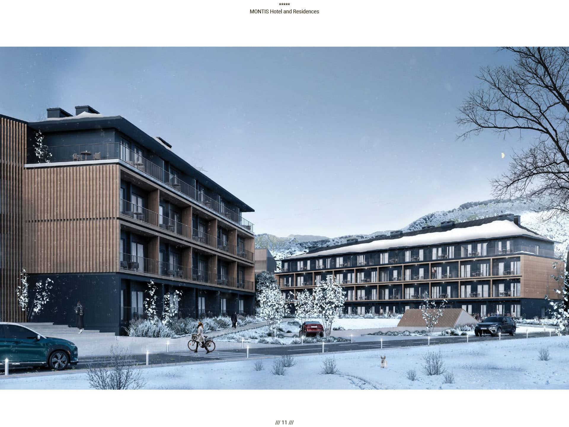 Прямые виды на горный массив Бьеласица, уединенная и нетронутая природа во многом повлияли на архитектуру отеля. Montis Hotel and Residences состоит из 238 единиц, включая ресторан, конференц-залы, кинотеатр, паб и SPA, крытый и открытый бассейн, детский клуб, лыжную комнату и гараж. Архитектурная идея заключалась в создании нового эталона современного дизайна, соответствующего контексту горного региона. Большой конференц-зал отеля, вмещающий до 400 посетителей, дополняется двумя небольшими конференц-залами вместимостью 50 мест. В дополнение к культурным удобствам города в отеле есть полностью оборудованный 3D-кинотеатр, вмещающий до 72 посетителей. Помимо кинотеатра, паб отеля на 120 мест также предназначен для ежедневных гостей. В качестве уникального элемента дизайна над большей частью первого этажа находится гостиничная «площадь», предназначенная для различных видов культурных, развлекательных или частных гостиничных мероприятий, место встречи и городской сад для гостей отеля, возвышенная платформа с прекрасным виды на реку Тара и пышный массив Бьеласица.