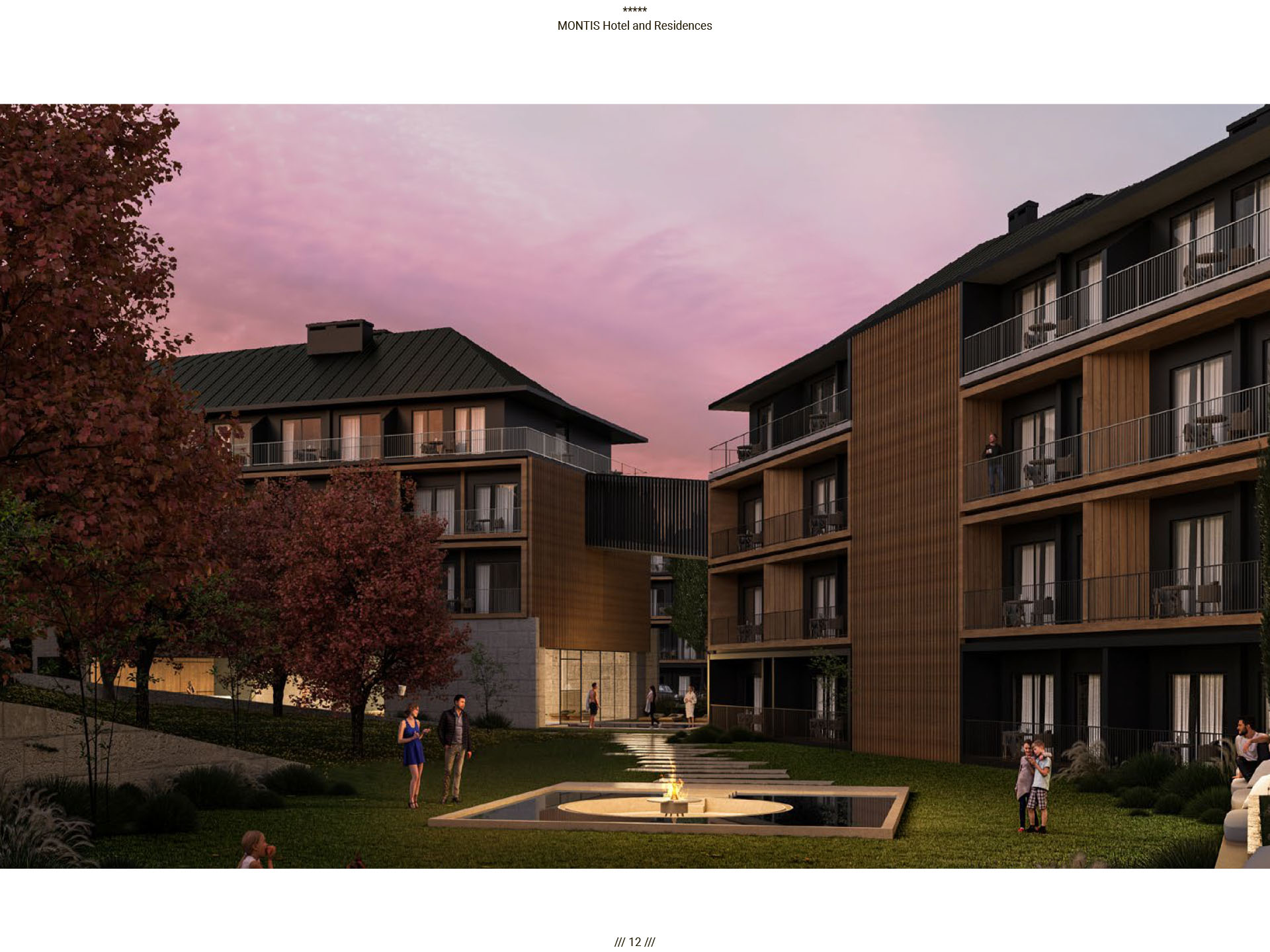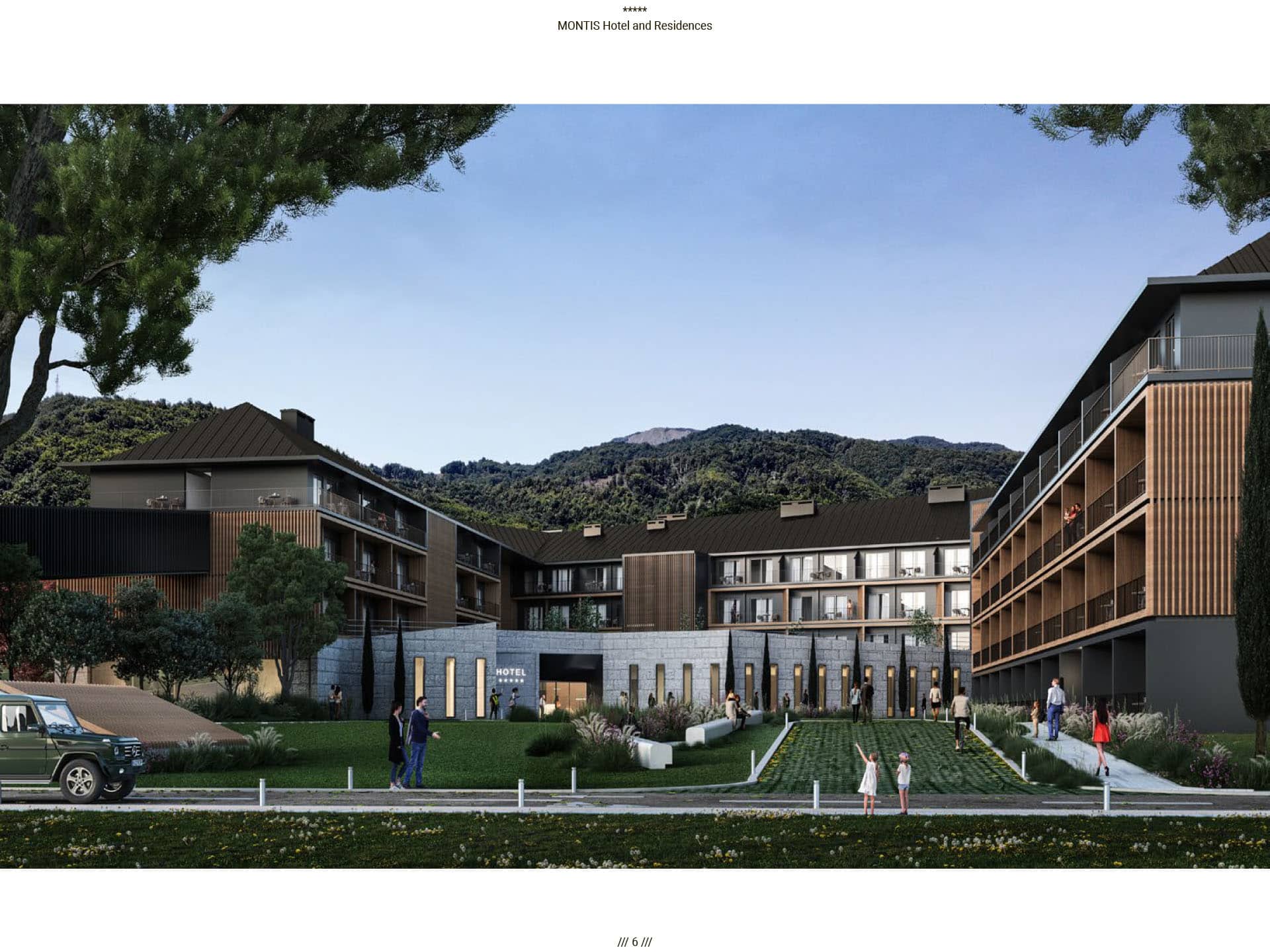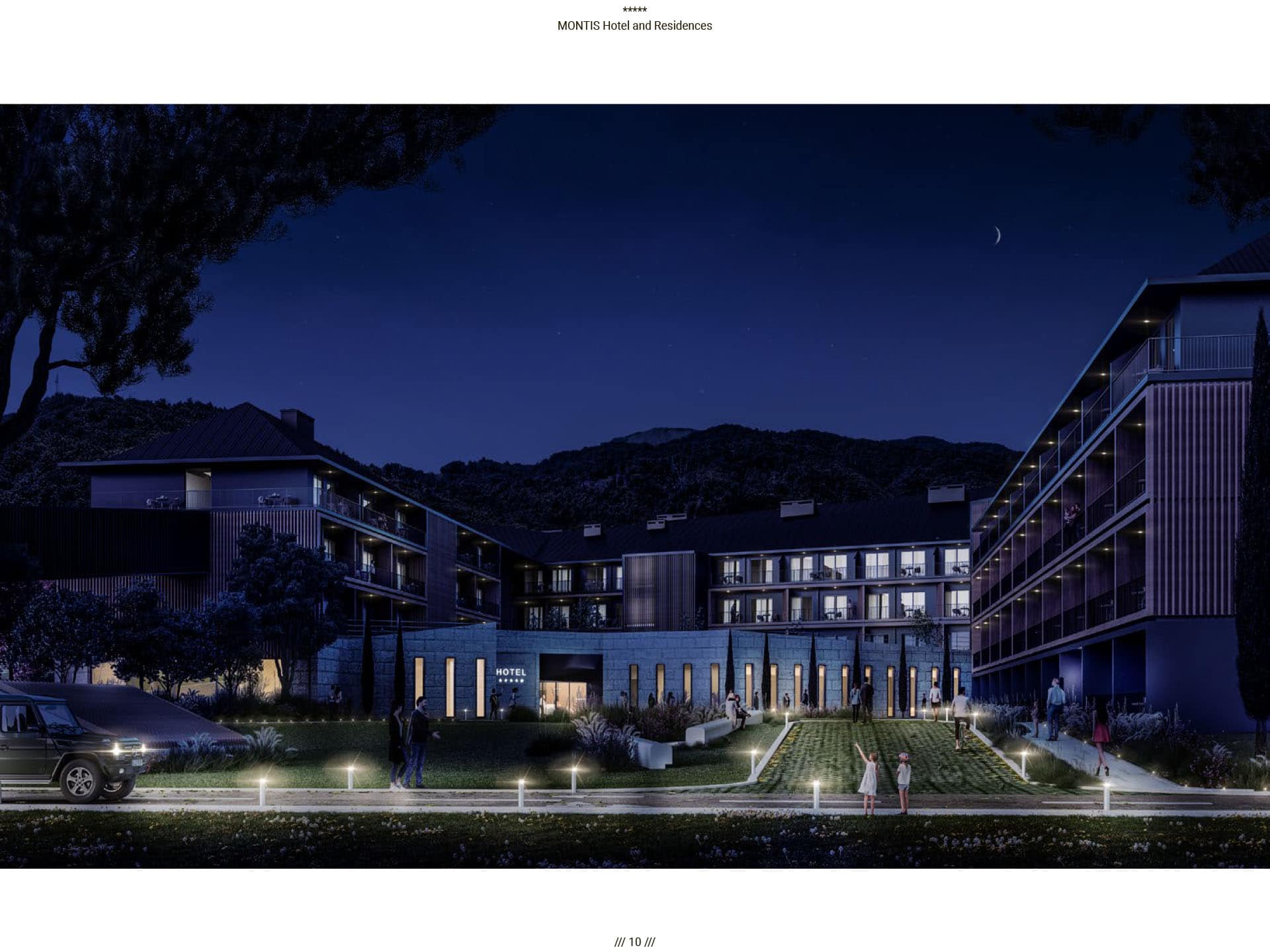 Прямые виды на горный массив Бьеласица, уединенная и нетронутая природа во многом повлияли на архитектуру отеля. Montis Hotel and Residences состоит из 238 единиц, включая ресторан, конференц-залы, кинотеатр, паб и SPA, крытый и открытый бассейн, детский клуб, лыжную комнату и гараж. Архитектурная идея заключалась в создании нового эталона современного дизайна, соответствующего контексту горного региона. Большой конференц-зал отеля, вмещающий до 400 посетителей, дополняется двумя небольшими конференц-залами вместимостью 50 мест. В дополнение к культурным удобствам города в отеле есть полностью оборудованный 3D-кинотеатр, вмещающий до 72 посетителей. Помимо кинотеатра, паб отеля на 120 мест также предназначен для ежедневных гостей. В качестве уникального элемента дизайна над большей частью первого этажа находится гостиничная «площадь», предназначенная для различных видов культурных, развлекательных или частных гостиничных мероприятий, место встречи и городской сад для гостей отеля, возвышенная платформа с прекрасным виды на реку Тара и пышный массив Бьеласица.