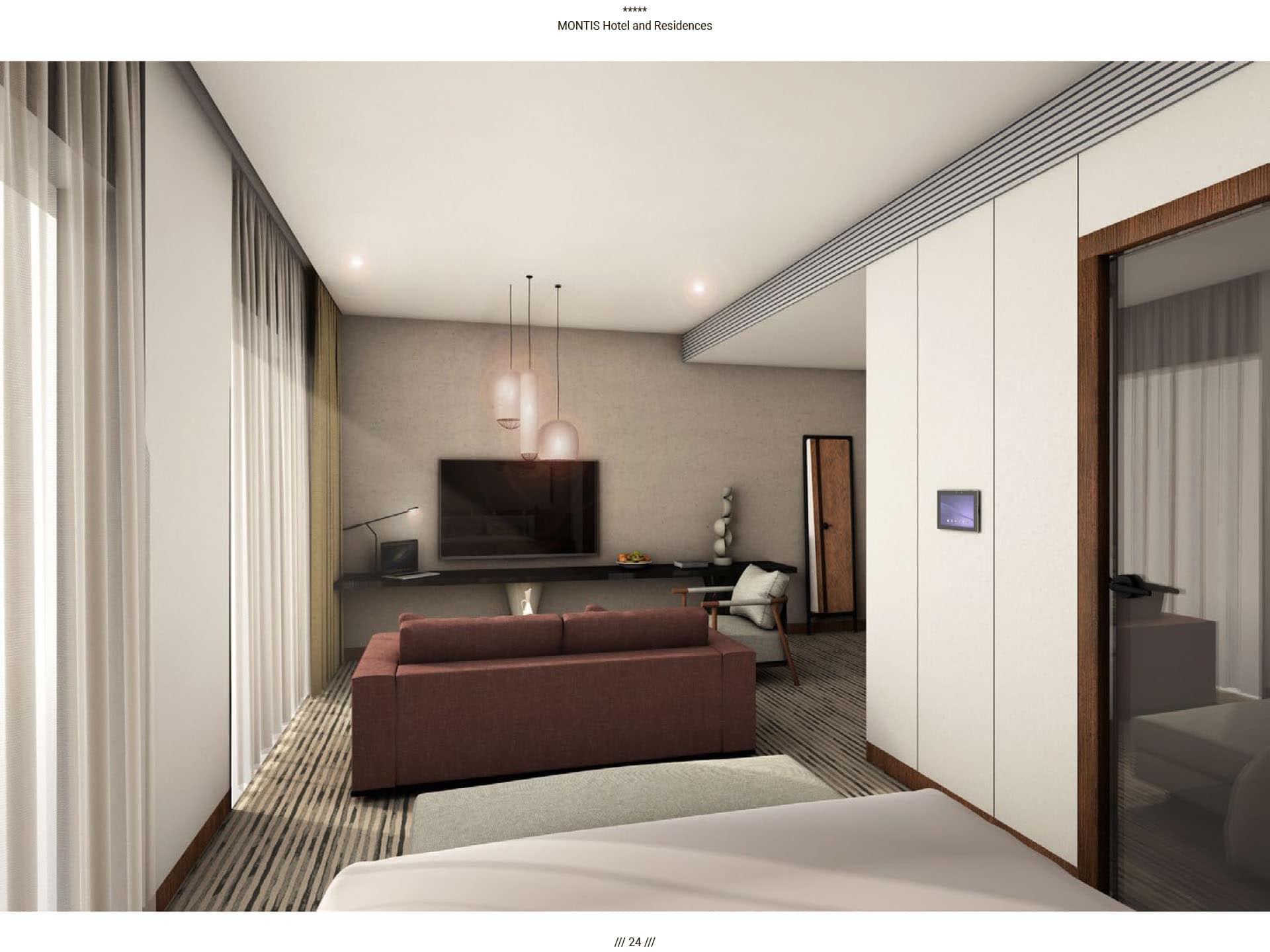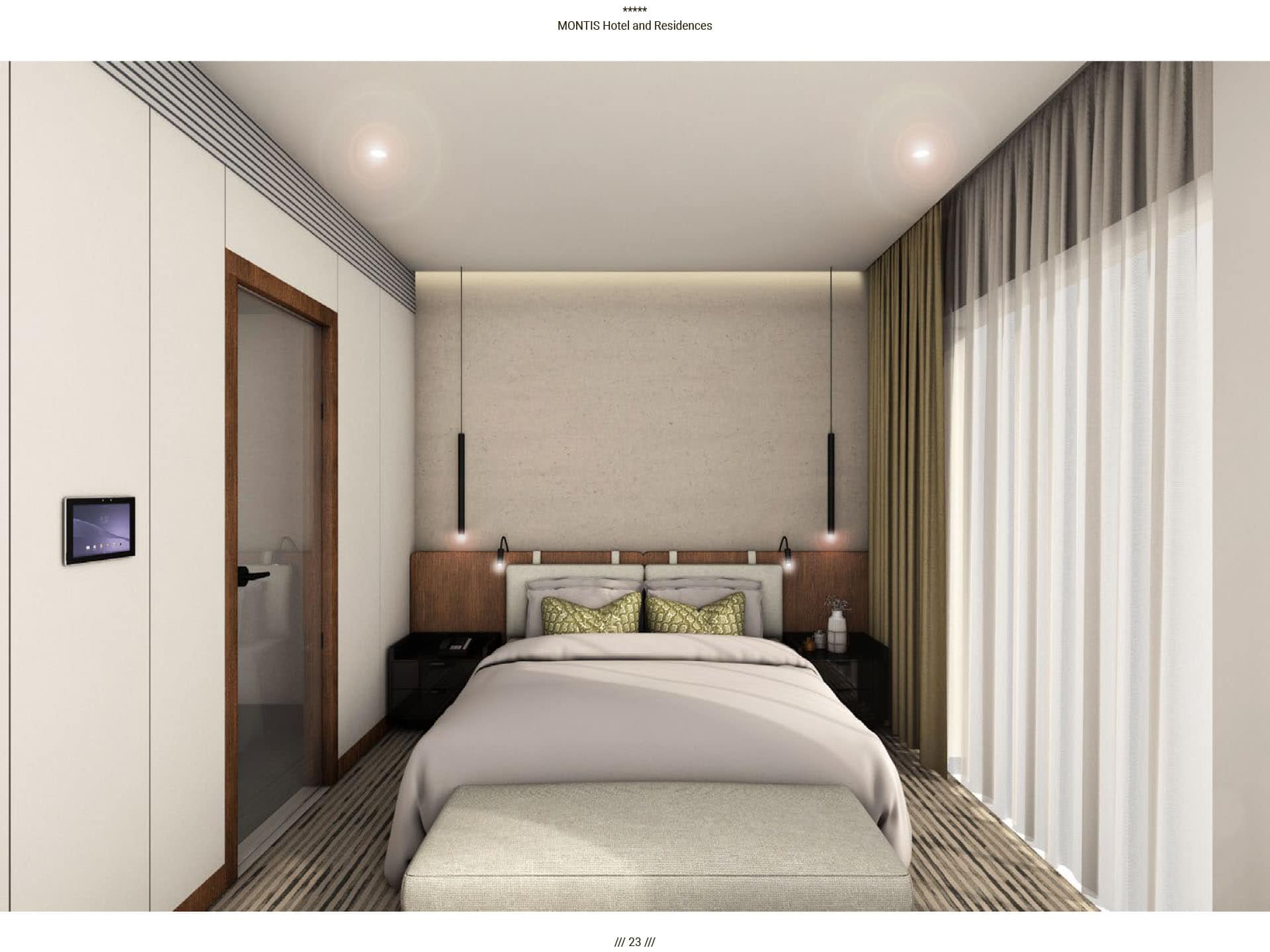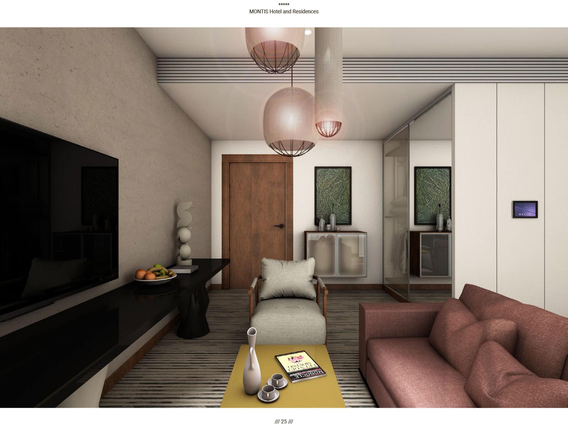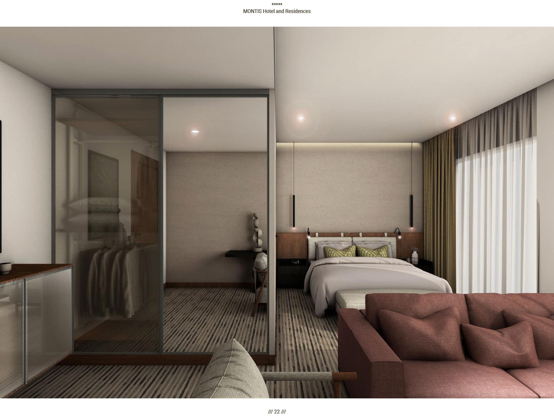 Прямые виды на горный массив Бьеласица, уединенная и нетронутая природа во многом повлияли на архитектуру отеля. Montis Hotel and Residences состоит из 238 единиц, включая ресторан, конференц-залы, кинотеатр, паб и SPA, крытый и открытый бассейн, детский клуб, лыжную комнату и гараж. Архитектурная идея заключалась в создании нового эталона современного дизайна, соответствующего контексту горного региона. Большой конференц-зал отеля, вмещающий до 400 посетителей, дополняется двумя небольшими конференц-залами вместимостью 50 мест. В дополнение к культурным удобствам города в отеле есть полностью оборудованный 3D-кинотеатр, вмещающий до 72 посетителей. Помимо кинотеатра, паб отеля на 120 мест также предназначен для ежедневных гостей. В качестве уникального элемента дизайна над большей частью первого этажа находится гостиничная «площадь», предназначенная для различных видов культурных, развлекательных или частных гостиничных мероприятий, место встречи и городской сад для гостей отеля, возвышенная платформа с прекрасным виды на реку Тара и пышный массив Бьеласица.