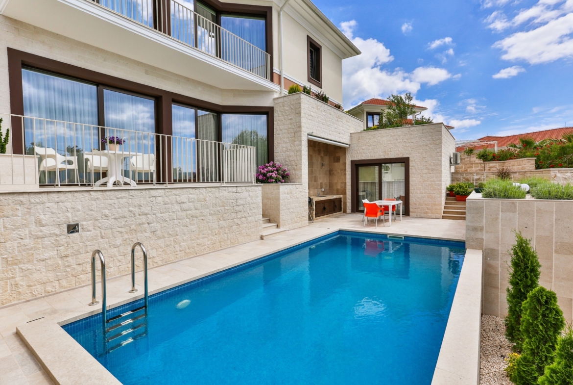 Вилла расположена в тихом и живописном районе города Тиват. Шикарный вид из окна, никого не оставит равнодушным. Рядом большой городской парк и вся необходимая инфраструктура, всего в 5 минутах ходьбы расположен крупный супермаркет и автостанция. А в 2 км находится лучшая в Черногории, марина для яхт Porto Montenegro. Площадь виллы 240 м2, участок 570 м2.На участке выполнен ландшафтный дизайн и установлена система капельного полива. Также расположен бассейн с системой очистки воды без использования хлора.