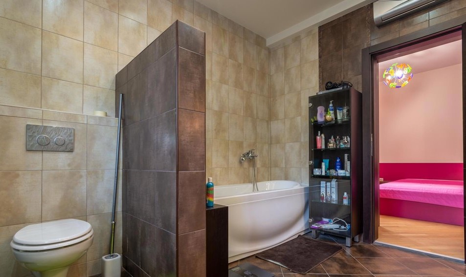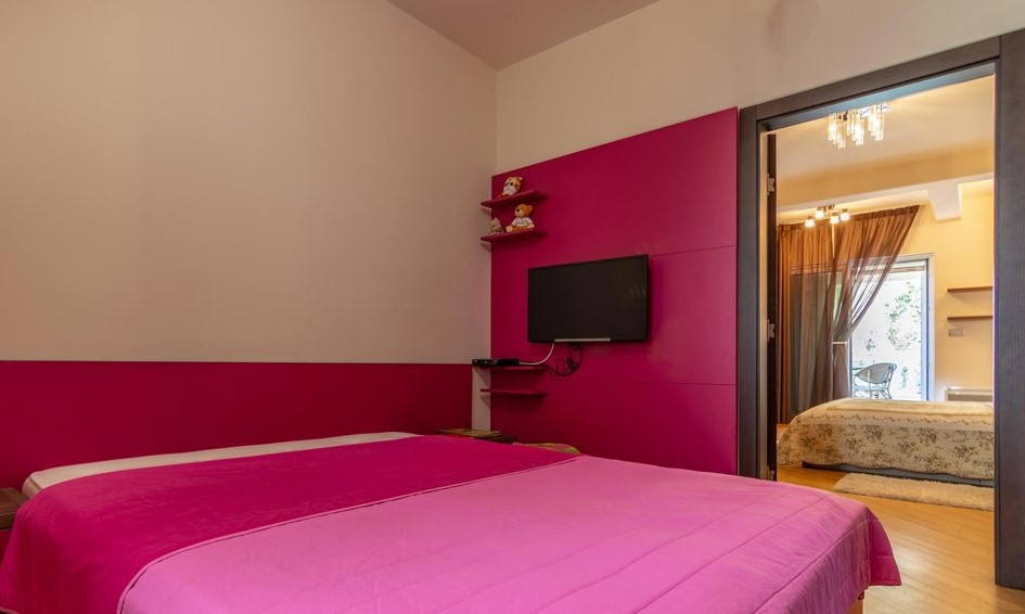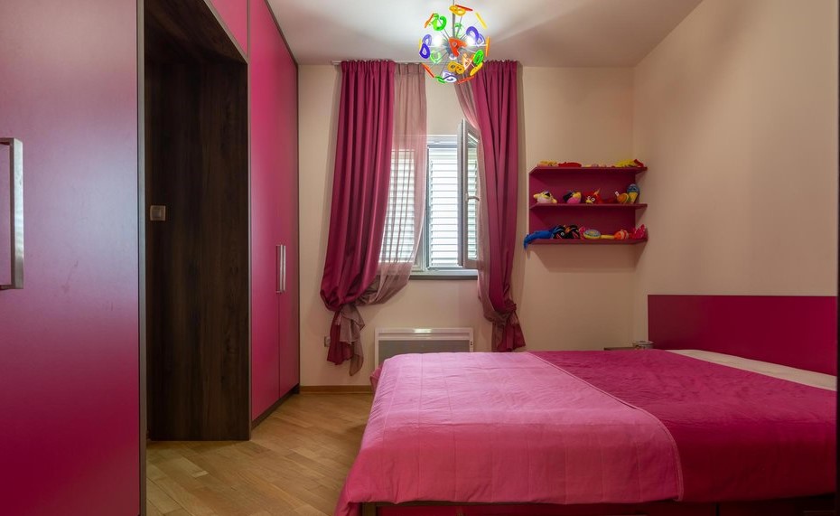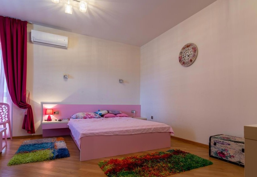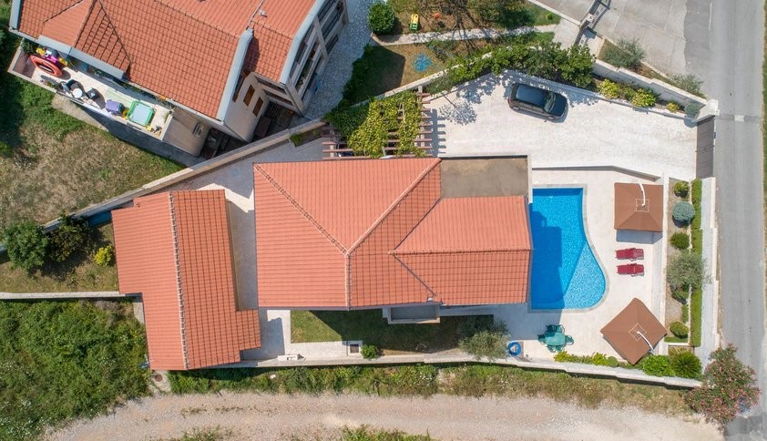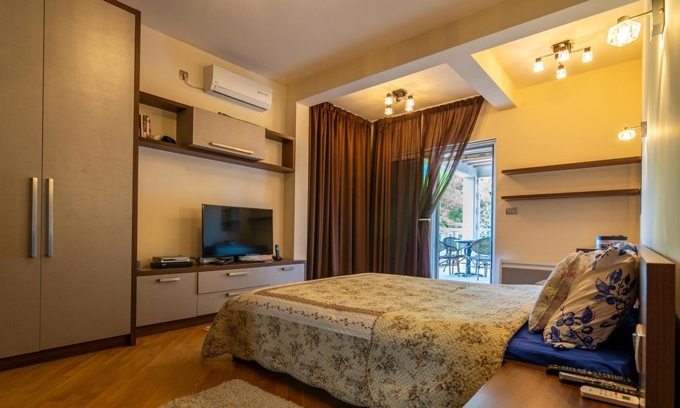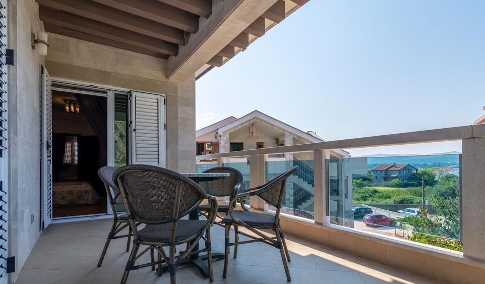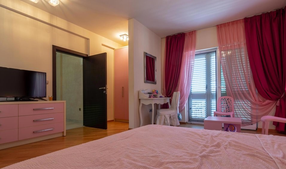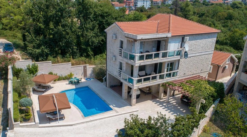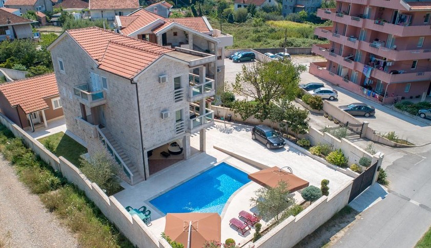 На территории есть ,бассейн, лаундж зона, зона барбекю, а также небольшой гостевой дом, общей площадью 60м2, планировка которого располагает гостиной, столовой зонами, кухней и ванной комнатой. Расстояние до центра Тивата и Порто Монтенегро составляет 2км.