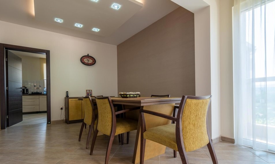На первом этаже расположилась кухня, с просторной гостиной и столовой зонами, спальная комната с ванной комнатой и терраса.