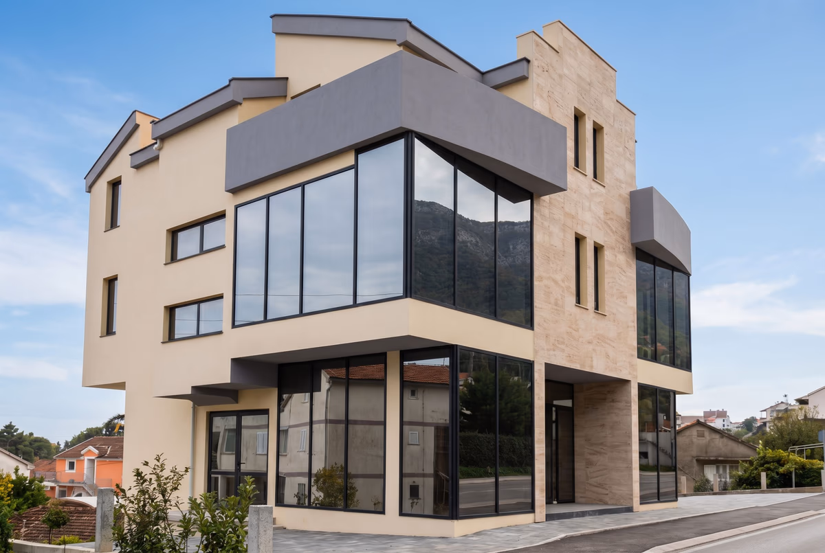 Помещение выполнено в современном архитектурном стиле с акцентом на панорамное остекление, что обеспечивает максимальное естественное освещение и визуальный простор. Свободная планировка позволяет адаптировать пространство под различные виды бизнеса: офис, клинику, шоурум, фитнес-центр, салон или апартаменты. Здание имеет удобный доступ с дороги и возможность организации парковки. С верхних уровней открывается вид на море и окружающие пейзажи.
